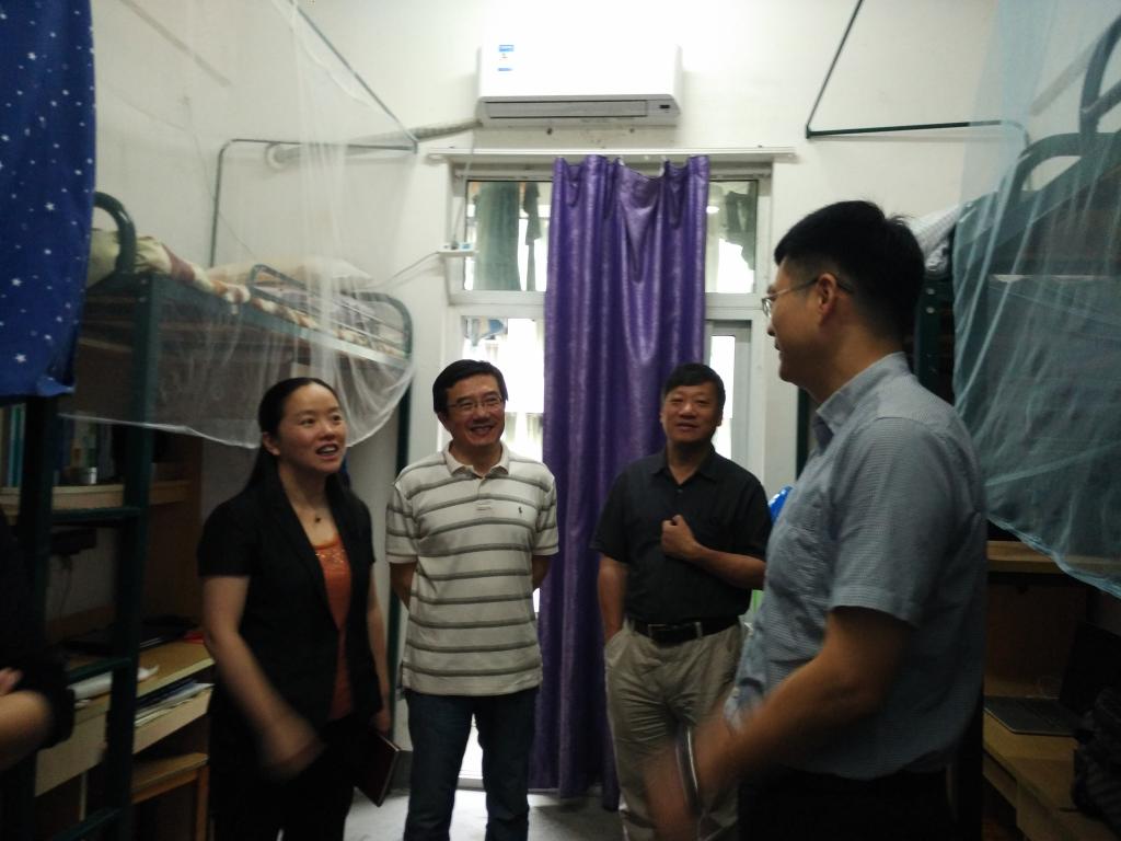 学校领导在院领导的陪同下视察了同学们的住宿卫生及宿舍安全状况,并亲切地与在校同学交流,与随访的相关人员就学校基础设施建设及文明寝室文化校园建设进行了探讨。