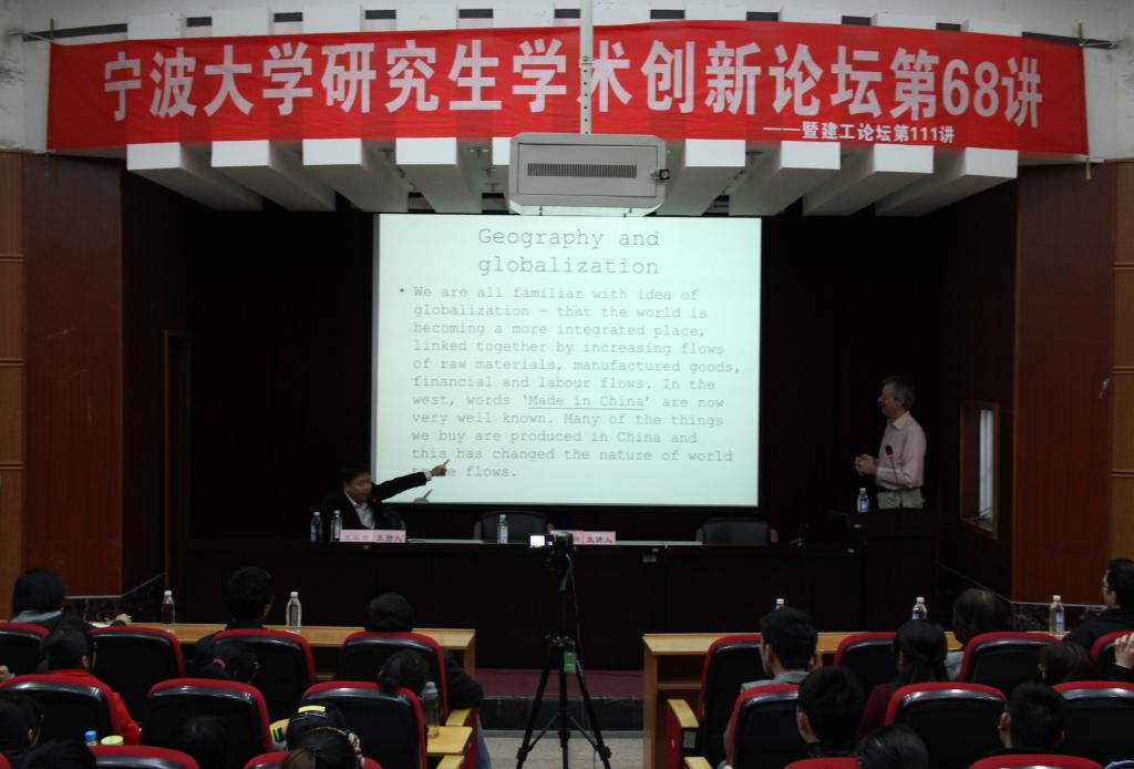 哈姆尼特教授以什么是地理学作为切入口,逐步过渡到对于地理学重要性的阐述上,并指出在当今全球化的进程中,地理学对于经济、政治等方面的重要影响。在谈到space-time compression(意为时空压缩)时,哈姆尼特教授借用大量的图片和数据资料,形象地为我们讲解了在当今社会space-time compression的具体表现方面。论及学术界流传一时的地理学终结论,教授鲜明地表现了自己的立场:经济的发展离不开地理学,而经济的发展需要也会促进地理学的进一步发展。所以,地理学知识对于普通公民也是相当重要的。