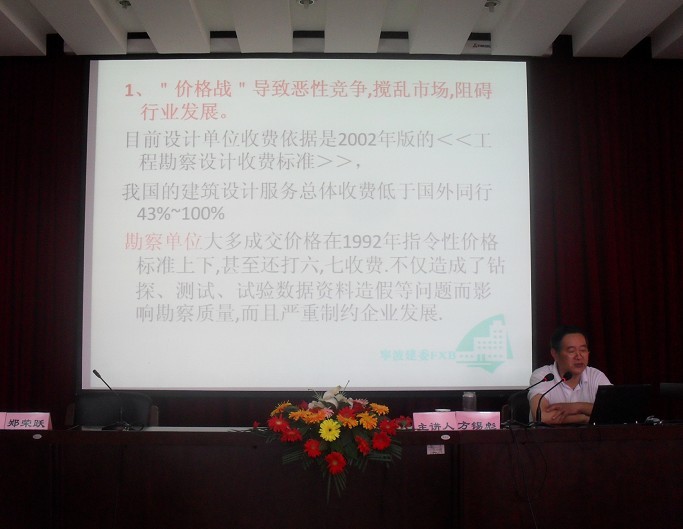 方锡彪副主任主要分管市住房和城乡建设委员会的政策法规、信访和诉讼、社会综合治理、建设房产行政执法、勘察设计行业管理、建筑节能、建设科技、教育培训、施工图审查等工作。报告会上,方主任以翔实的数据资料,从宁波市建筑行业的企业数量、企业资质、企业性质、从业人员、近期业绩、存在问题以及外界比较等七个方面向在座师生介绍了宁波市建筑行业的现状,并重点强调了“价格战”、“低水平重复竞争”、“大牌照小队伍”的资质挂靠现状等主要问题。随后,方主任介绍了在未来几年内建筑行业的发展趋势,如县市小企业面临生存危机、勘察设计收费标准有望调整、未来建筑行业拥有良好发展机遇等等。
