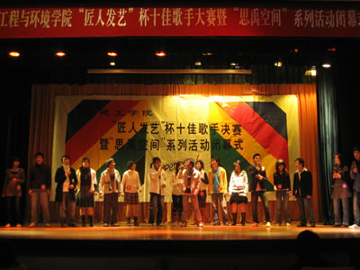 晚会首先通过短片展示的方式,回顾了整个“思禹空间”系列活动的精彩瞬间,在优美音乐的衬托下,大屏幕上的画面极具震撼力,给整个“思禹空间”系列活动做了一个生动直观,细致周全的总结。接下来的十佳歌手大赛中,选手们富有磁性的嗓音和动感的舞台表现赢得了一阵阵喝彩。台下观众们高举海报、宣传牌大声呼喊,支持自己衷爱的选手,或手捧鲜花,登台献上。台上台下一齐互动,将本场晚会推上高潮。最终,杨超等同学荣获了“院十佳歌手”称号,而本次活动最佳人气奖被贾波和徐帆平摘得。