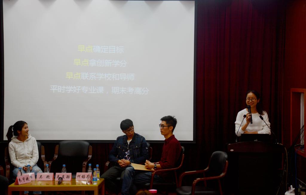 座谈会伊始,作为考研保研成功的学长学姐们分别分享了他们各自的经历,也让同学们初步了解到有关于考研保研的相关流程和注意事项。直博同济大学的童森杰同学以历年同济大学的分数线为例,讲述了自己关于保研的经验。他说考研不一定好的大学就比差的大学难考,还要看专业水平和许多其他的因素,不能一概而论。此外,他还说关于考研最重要的一点是要不断地问自己:“我能不能以及适不适合静下来专注地做一件事?”如果可以,那么也许考研是一个不错的选择。何锡存同学分享了他参加上海交通大学夏令营并成功保研的经历,让同学们知道要敢想敢拼,也许就会成功。保研中科院城市科学研究所的吴直颖同学则讲述了关于论文发表和学术严谨的重要性,成功考上华侨大学的吴艳同学以自身的经历告诉大家考研需早作准备,考研华东师范大学的陈炳同学和考研南京师范大学的朱宇婕同学也分别分享了自己的备考经验。最后,现场的提问环节也进行地十分热烈,可见学院同学们对考研保研的兴趣浓厚。