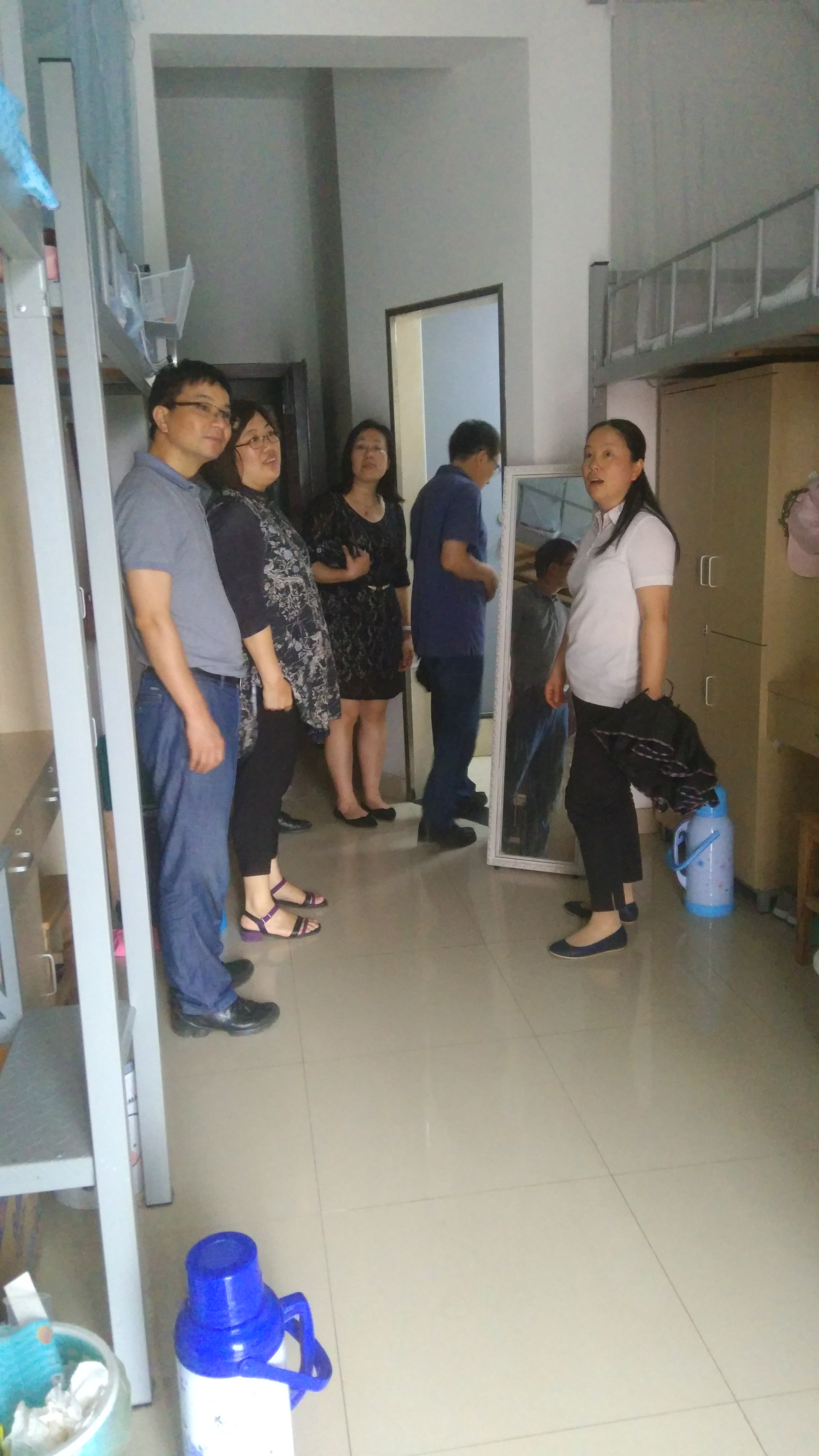 学校领导在院领导的陪同下视察了同学们的住宿卫生及宿舍安全状况,并亲切地与在校同学交流,与随访的相关人员就学校基础设施建设及文明寝室文化校园建设进行了探讨。