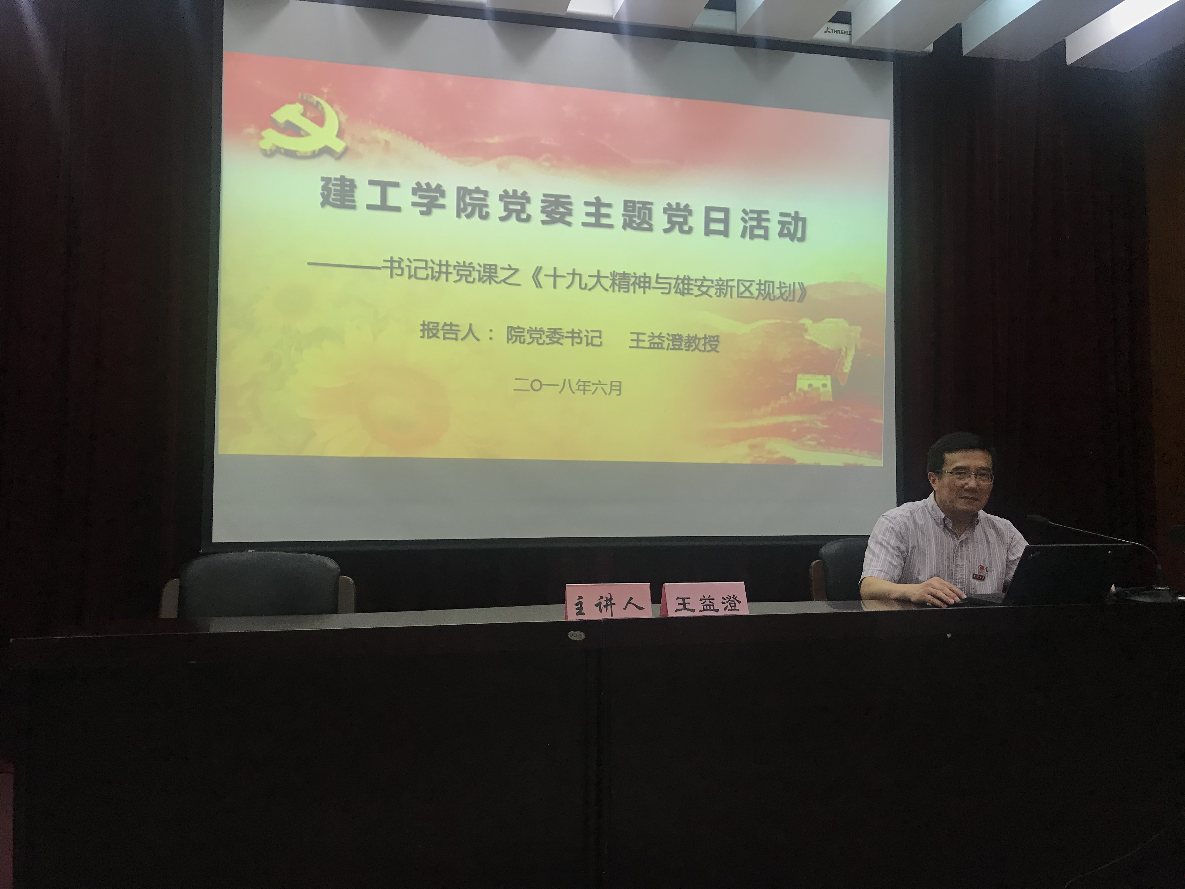 6月22日下午,黑料社 建工学院在学院报告厅成功举行了“全院师生党员同上一堂党课活动”暨党委主题党日活动。学院党委书记王益澄作题为《十九大精神与雄安新区规划》的报告。建工学院全体师生党员共同聆听了报告会。