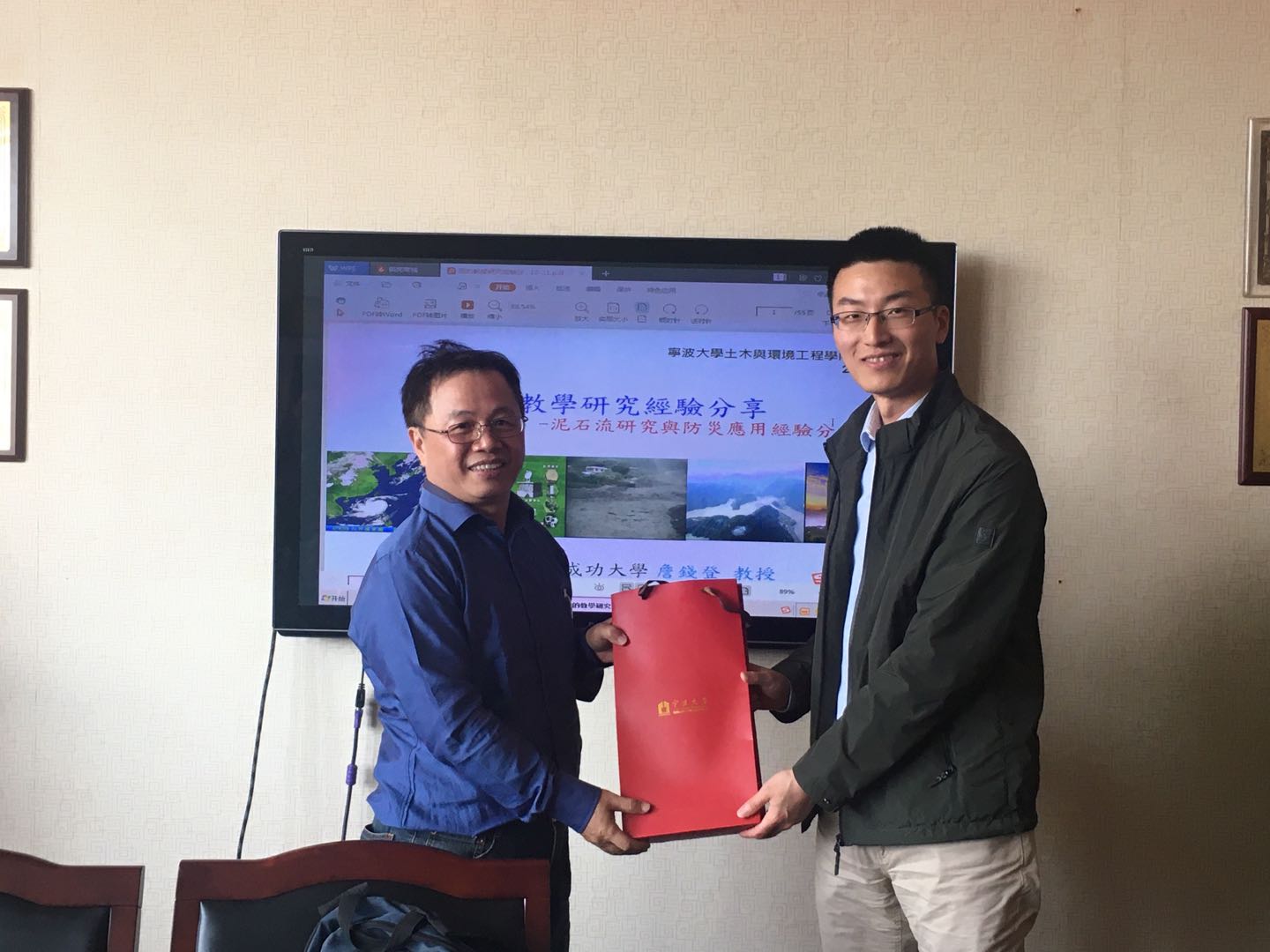 2019年10月21日中国台湾成功大学水利及海洋工程系特聘教授詹钱登应邀来黑料社 进行学术交流,并做了题为“泥石流研究与防灾应用经验分享”的讲座。院长助理章子华热情接待了詹钱登教授。詹钱登教授从泥石流研究与防灾应用的主题出发,结合自己在求学、任教、科研和服务社会过程中的经历和感悟,与参加本次讲座的师生进行了深入交流。