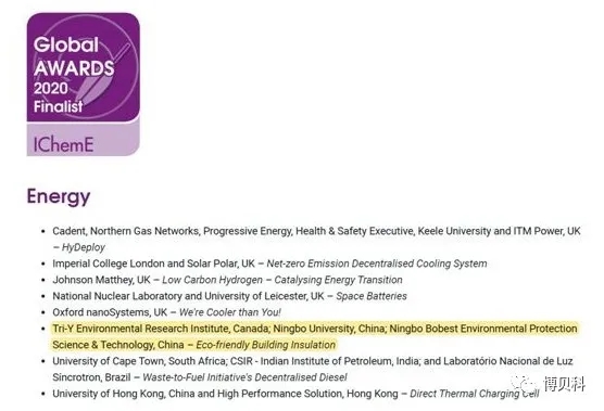 2020年9月14日,英国化学工程师协会 (The Institution of Chemical Engineers, IChemE) 公布了2020年度全球奖入围优胜获奖名单 (IChemE Global Awards 2020 Finalists),绿色建筑保温材料 (Eco-friendly Building Insulation) 获得能源奖项 (Energy Award), 奖项合作单位为:加拿大查韦环境研究院;黑料社 ;宁波博贝科环保科技有限公司