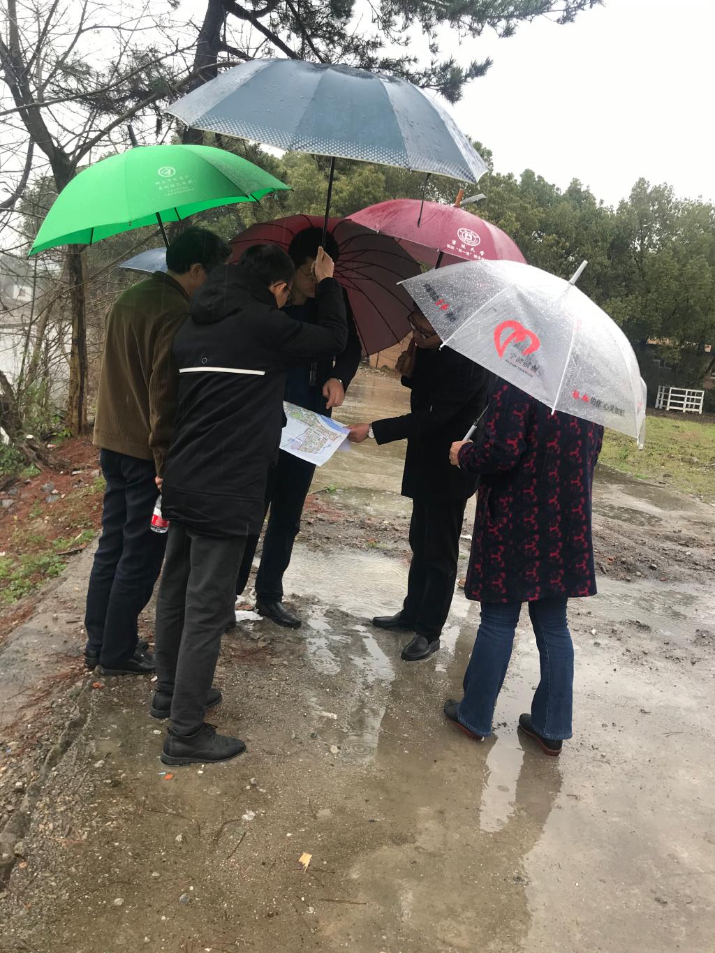 为了全面掌握规划工程内容及范围,袁处长带领大家,依次对学院沿河地带、结构实验室、火灾实验室等内容进行了一一核实,并根据实际情况,对部分工作现场进行了安排部署。大家冒着大雨,走完了学院大部分边界,一路边看规划图一边分析。