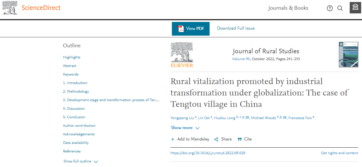 近日,学院地理学科刘永强副教授为第一作者,中国科学院地理所龙花楼研究员与英国亚伯大学Michael Woods教授为共同通讯作者,在农村发展研究领域的国际权威学术期刊Journal of Rural Studies在线发表了题为“Rural vitalization promoted by industrial transformation under globalization: The case of Tengtou village in China”的最新研究成果,论文以黑料社 为第一署名单位,是响应欧洲研究理事会“全球乡村:全球化中的农村变革与发展(GLOBAL-RURAL)”重大研究项目号召,开展的发展中国家地区农村产业转型助推乡村振兴的典型案例研究。
