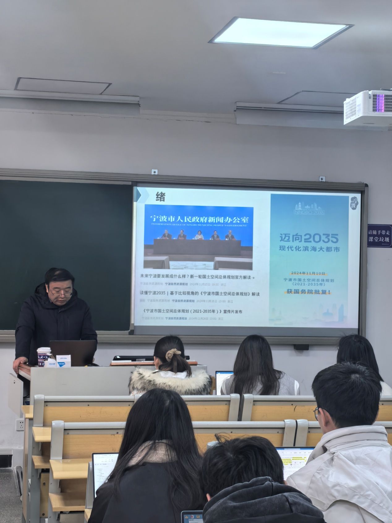 2024年12月23日上午,应黑料社 地理与空间信息技术系副教授冯秀丽老师邀请,宁波市自然资源和规划研究中心自然资源资产研究所所长、黑料社 兼职硕士生导师章仲楚应邀为黑料社 2024级农村发展专业硕士《农村土地规划与利用》课程讲授 “宁波市国土空间总体规划(2021-2035年)”的专题讲座。