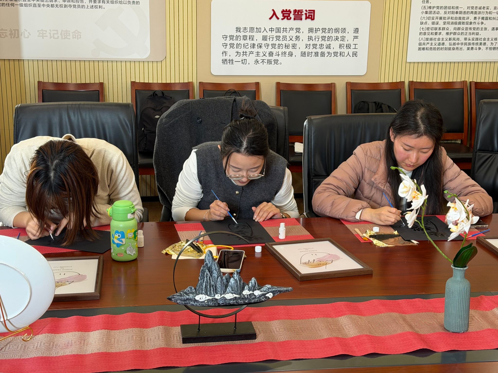 在创作金箔画时,师生党员们化身“非遗学徒”,从勾线、上胶到贴箔、扫箔,每一步都凝神专注。有人选择绘制中国地图,寓意着每一位党员心中那份“一寸丹心图报国”的赤诚与担当;有人选择勾勒挺拔的翠竹,竹节分明的线条里藏着对“守节如竹”的期许;还有人偏爱绽放的青莲,金箔覆上的花瓣泛着温润光泽,恰似廉洁品格的纯粹通透。