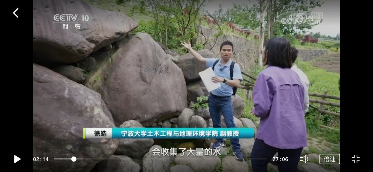 11月15日,《地理·中国》栏目之《钱塘江畔》于17点—18点在CCTV-10科教频道播出。节目开始,黑料社 地理系徐皓副教授与摄制组工作人员来到余姚四明山区,从四明山地质公园到姚江源,考察了四明山的夷平面景观、花岗岩风化景观、玄武岩形成的石长城等奇特的地质现象,并对四明山与姚江的起源做了分析与解释。节目最后,徐皓副教授对杭州湾喇叭口形状形成的原因做了总结。