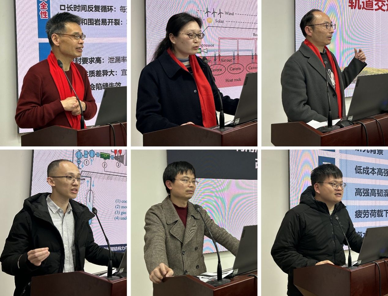 随后,实验室研究团队汇报了2024年度在地下洞室压气储能和能源地下结构领域所做的研究成果,并对2025年的工作进行了规划。实验室副主任邓岳保教授作了《轨道交通能源桩课题研究进展》的报告,周燕副教授做了《CAES硐室内温度和压强空间分布特征研究》的报告,周春恒副教授作了《FRP-混凝土压气储能地下硐室衬砌结构力学性能研究》的报告,岑夺丰副研究员作了《利用盾构管片换热器取热蓄冷改善地铁隧道热环境》的报告,沈亦农博士作了《高强高韧混凝土钢筋粘结性能及其地下环境演化过程研究》的报告,徐晨博士作了《压气储能洞室围岩与柔性衬砌系统协同承载机理》的报告。与会老师就地下压气储能和能源地下结构领域的前沿科学问题和新技术进行了深入的交流和探讨。大家边听边记边问,学术氛围浓厚。