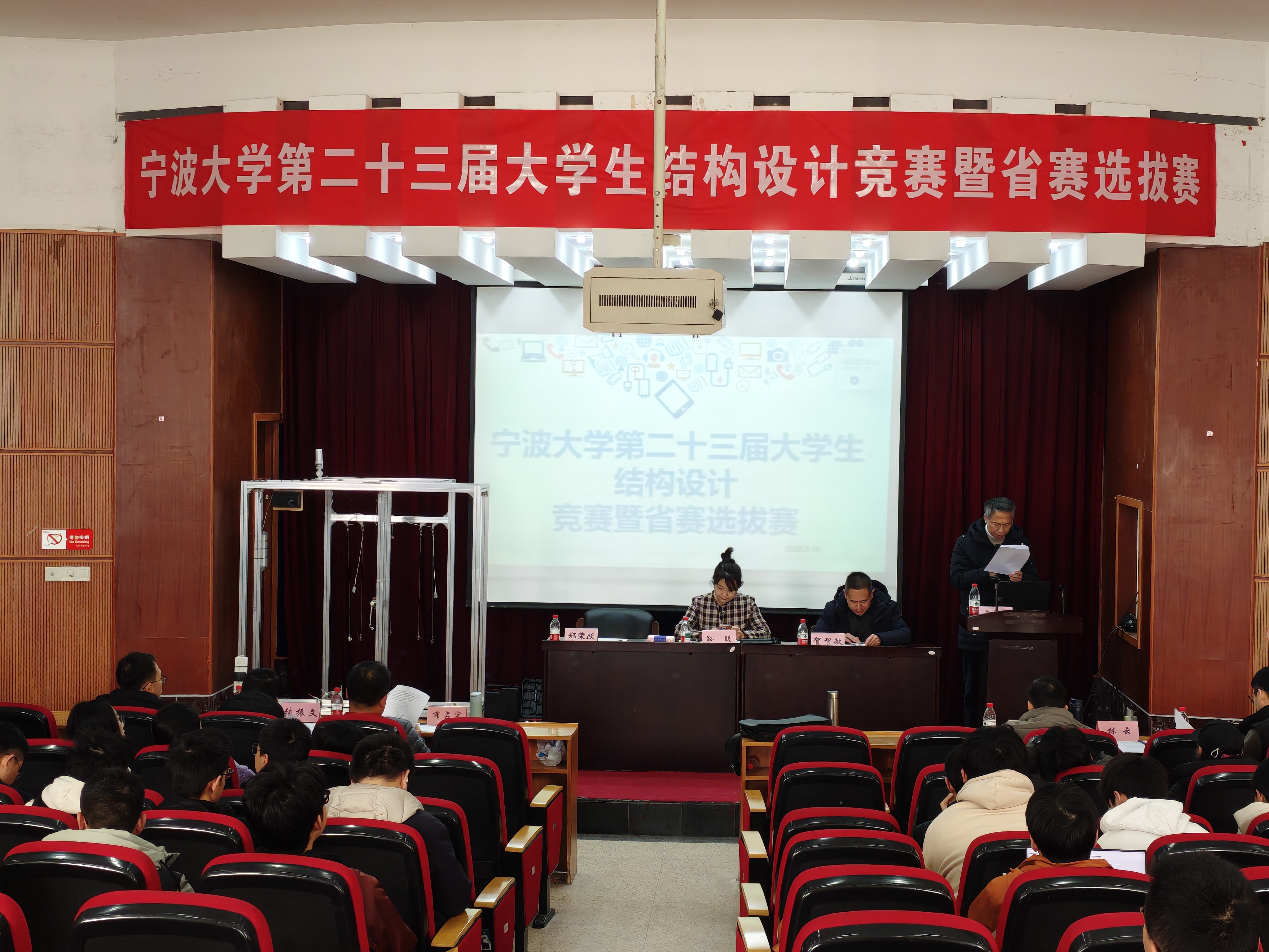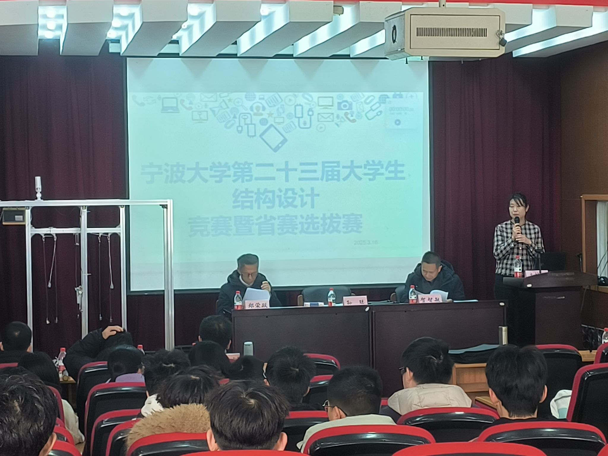 上午8:30,竞赛在庄严的开幕式中拉开帷幕。开幕式由贺智敏老师主持。教务处副处长孙聪出席并致辞,她强调:“结构设计竞赛是培养创新实践能力的重要平台,希望同学们以赛促学、以学促用,在挑战中锤炼工程素养。”随后,竞赛专家组组长郑荣跃教授详细宣读了比赛规则,为赛事奠定公平、专业的基调。