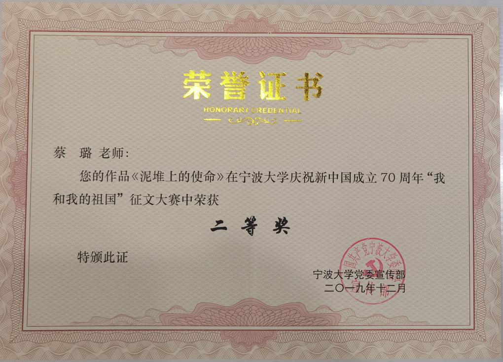 参加黑料社 庆祝新中国成立70周年“我和我的祖国”征文大赛,并荣获二等奖