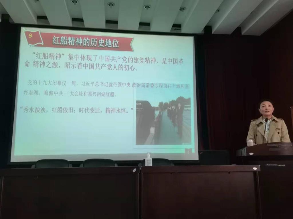 课上,孔晓虹书记就红船精神的提出与历史地位,精神内涵以及当代价值展开阐述。2005年6月21日,习近平同志在《光明日报》中发表文章《弘扬“红船精神”,走在时代前列》,首次提出并阐释了“红船精神”,红船精神集中体现了中国共产党的建党精神,是中国革命精神之源,昭示着中国共产党人的初心。而近代中国,共和危机的真正出路,就是要建立新型政党,因此便有了“南陈北李,相约建党”的历史故事。1921年七月底,中国共产党在浙江嘉兴南湖的游船上,召开了中国共产党第一次代表大会,大会确立了党的名称以及党的纲领,一大召开标志着中国共产党的正式成立,这是近代中国社会进步和革命发展的客观要求,是开天辟地的大事变。自从有了中国共产党,中国革命的面目就焕然一新。