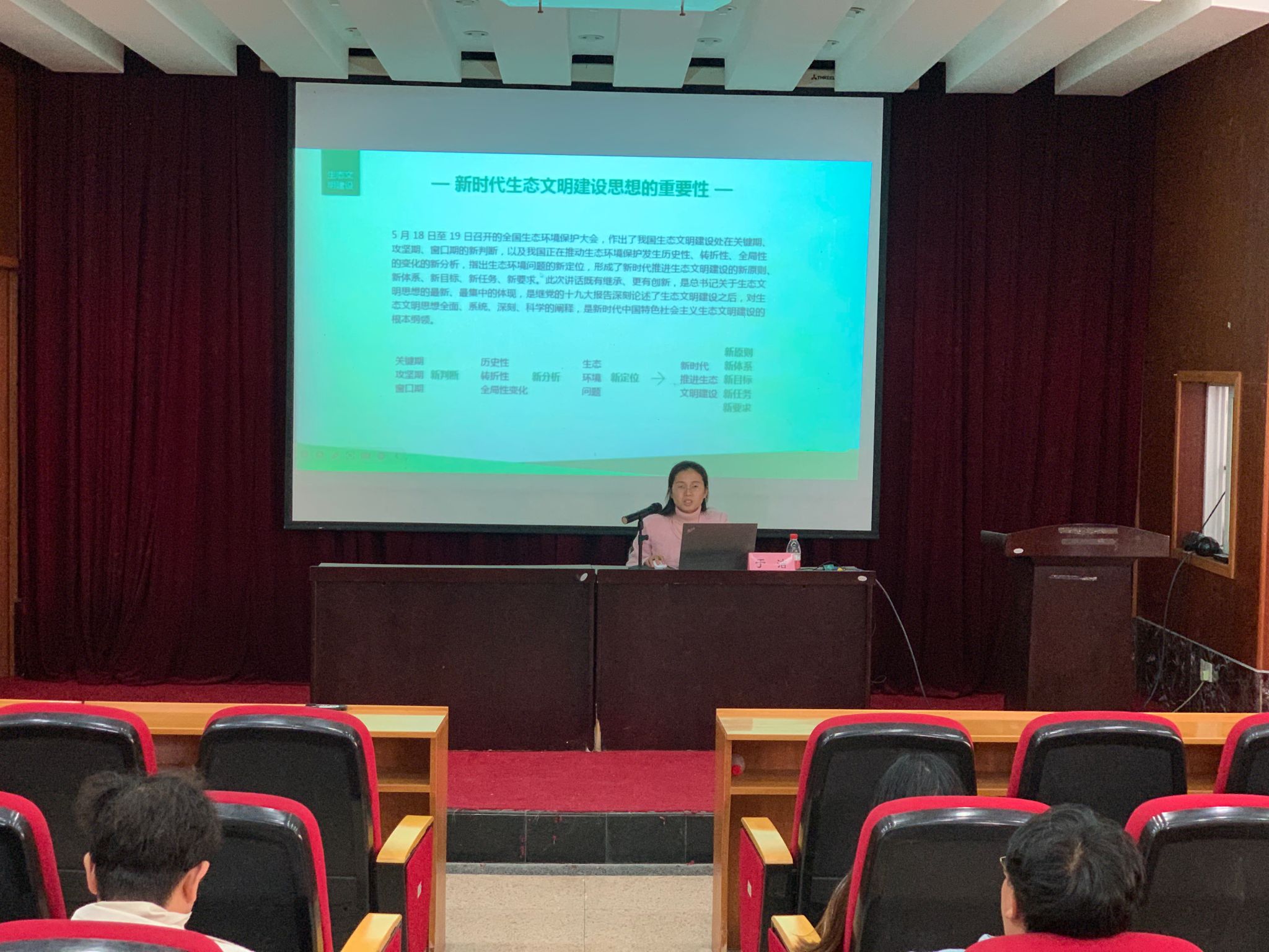 于洁老师紧扣新时代生态文明建设思想主题,深入阐释生态文明建设的时代特征与重要意义,佐以实际案例与专业知识,彰显党和国家在生态文明建设进程中的不懈努力与卓越智慧。后半程,于老师详细介绍学院环境系绿水清源 “巾帼文明岗”的相关情况,生动的讲述了其成员以守护绿水青山、助力美丽中国为信念,坚守环保初心,深耕生态保护研究,全力服务国家生态文明建设大业,于老师亦借此激励学员以巾帼岗为楷模,积极投身环保事业,为生态文明建设奉献青春力量。