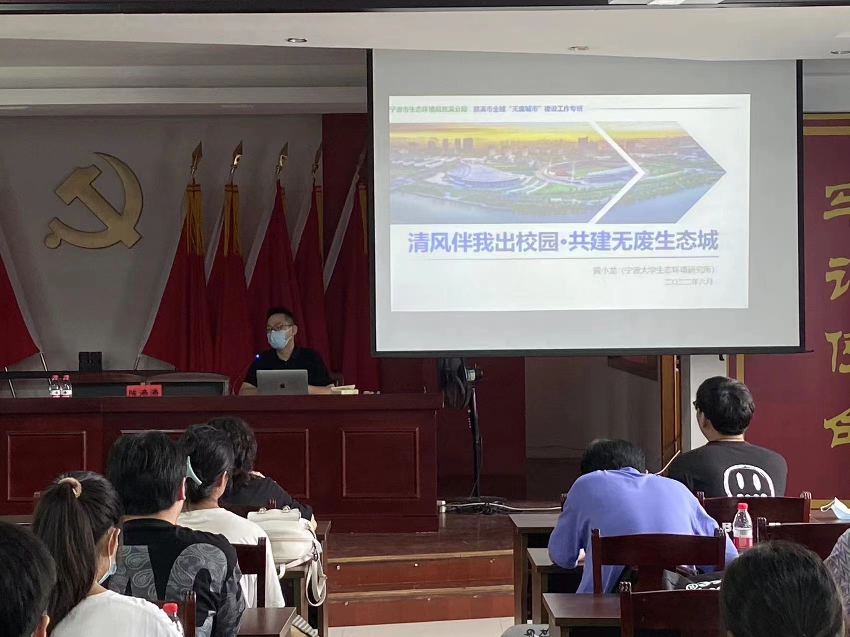 在参观傅家路村美丽庭院时,慈溪市无废办工作人员为宁大土环学院学生党员和宁大科院环境工程专业的同学一同开展了“无废城市我践行”的主题微党课,就慈溪市“无废城市”建设工作开展情况给师生们进行了分享,同学们围绕着“无废城市建设”“绿色生产生活”“乡村环境治理”“生态文明发展”等话题展开了热烈的讨论。此次微党课大大增强了学生党员们的环保理念,在会议室简单就餐之后,学生们纷纷将厨余垃圾与餐盒进行垃圾分类,用实际行动来践行环保理念。