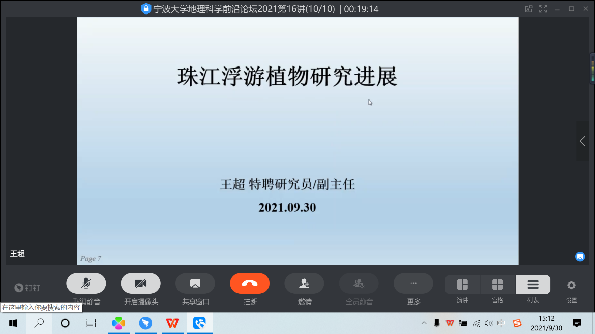 王老师以“珠江浮游植物研究进展”为题作了专题报告,介绍了团队在珠江流域开展的工作,并就珠江流域浮游植物研究进展进行了深入讲解。其中,王老师就珠江流域浮游植物研究趋势,微藻分类、群落预测分析、形态性状的指示功能及水质评价方法等做了详细介绍。报告结束后,与会人员就评价体系的建立、监测点指标及频率等领域内热点问题展开深入交流和讨论。吴乃成教授就链状硅藻的适应性机制以及分子鉴定方法提出建议。