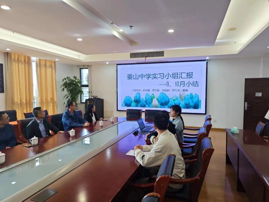 座谈会在姜山中学行政楼七楼会议室开展,姜山中学党委书记楼力敏、教务处葛晓红、地理组俞海萍、林梁杰、陆如良和沈苑超老师参加本次会议。首先,由史绎楠同学作为实习生代表,从教学工作和班级管理两个方面,汇报和展示近一个半月的实习工作进展。