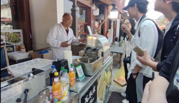 第一组成员在府前路历史文化街区进行了五次访谈,大致对商业街的业态、消费者的偏好进行了了解。作为第一批入选省非物质文化遗产主题街区,该街区商铺众多,店铺装修传统韵味十足,同类店铺特色各不相同。管理方还将非遗资源通过多元化方式转化成可体验、可分享、可消费的文旅元素,举办阳明古镇国潮节、戏曲专场演出等多项活动,其传统感和烟火气引人神往,吸引了来自五湖四海的游客。