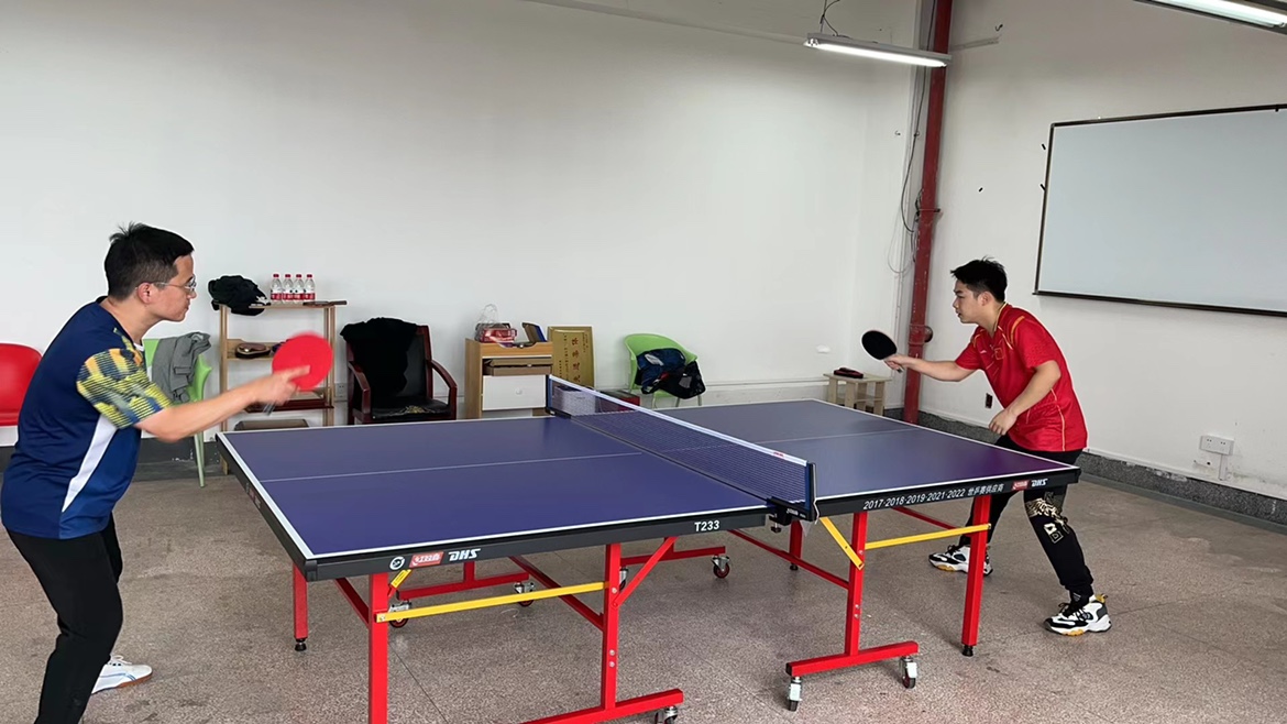 (教职工在新乒乓球桌上打球)