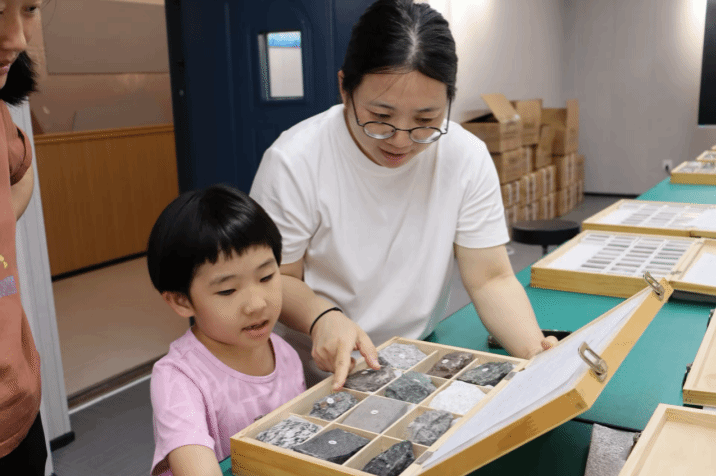 各类岩石矿物在灯光下熠熠生辉,李冬玲老师介绍了矿物的结构、成分与应用,小朋友们通过观察和触摸进一步理解了“脚下的世界”。