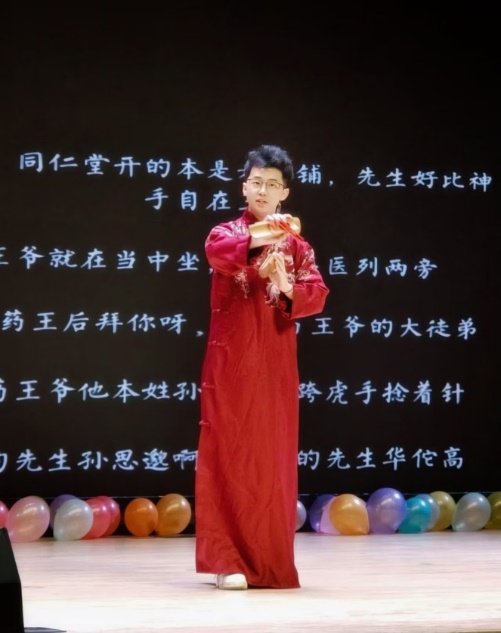 轻脆有力的快板声在会场里回响,来自23级土木工程研究生班的郭祎辰同学打响节奏、述说经典,演绎了一出《同仁堂》。